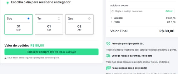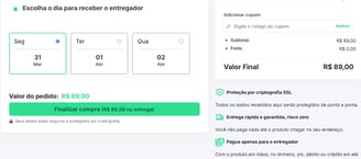 Depois, é só escolher uma data para receber o seu pedido e pagar na entrega.